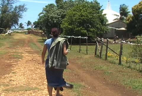 Rebecca is walking down the main road in Nomuka.