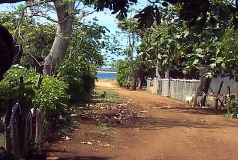Standing on the road in front of their house, this is the view to the left, toward the ocean. Beyond the blue sea, you can see the smaller, uninhabited island, Nomuka Iki. They can get there by sea kayak in about 40 minutes.