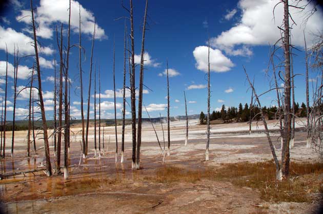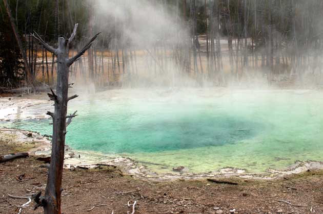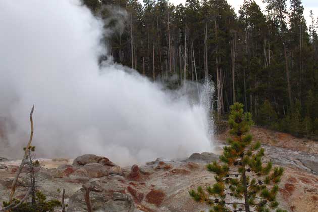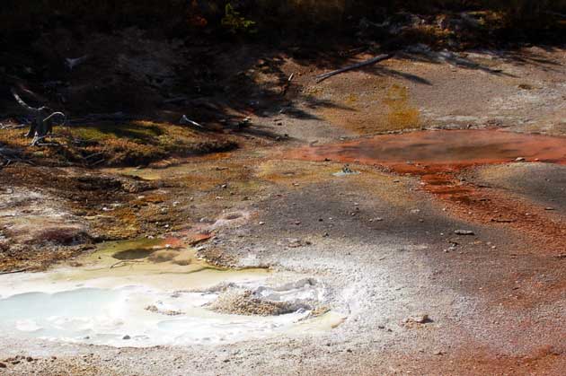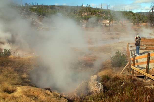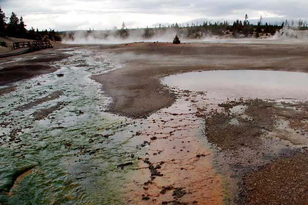 Norris Geyser Basin is the hottest and most changeable thermal area in Yellowstone. A trail through Porcelain Basin reveals the barren beauty of rainbow colors, hissing steam and pungent odors. The more heavily wooded Back Basin is encircled by a longer trail. Bubbling mud holes called Artist Paint Pots (bottom photo), just south of Norris Junction, can be viewed on a loop trail that passes hot springs and a section of forest burned in 1988.