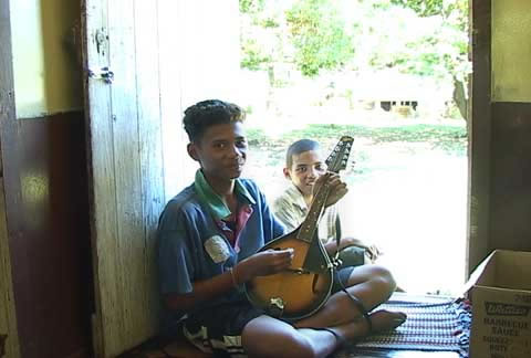 Justin's students hang around their place...why not, if you can learn to play the teacher's mandolin? The two young men are in the doorway that leads from the kitchen to the back yard.