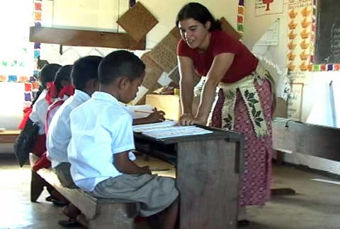 Rebecca teaches an English lesson to some of her students.