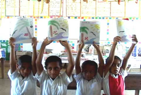 Rebecca's students show off their lessons. They had to understand the English words for blue, green, red, yellow and brown in order to color in the pictures she drew.