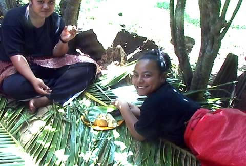 Two Nomukan girls eat at a funeral gathering