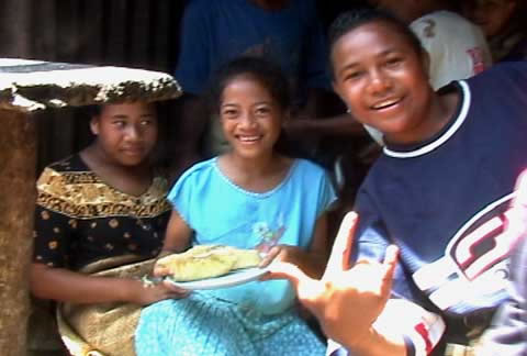 Three young Nomukans pose at an island gathering in advance of a funeral. The family of the deceased has to feed the entire village.