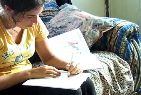 Rebecca prepares lessons on the living room sofa